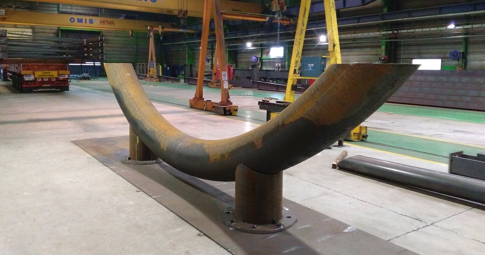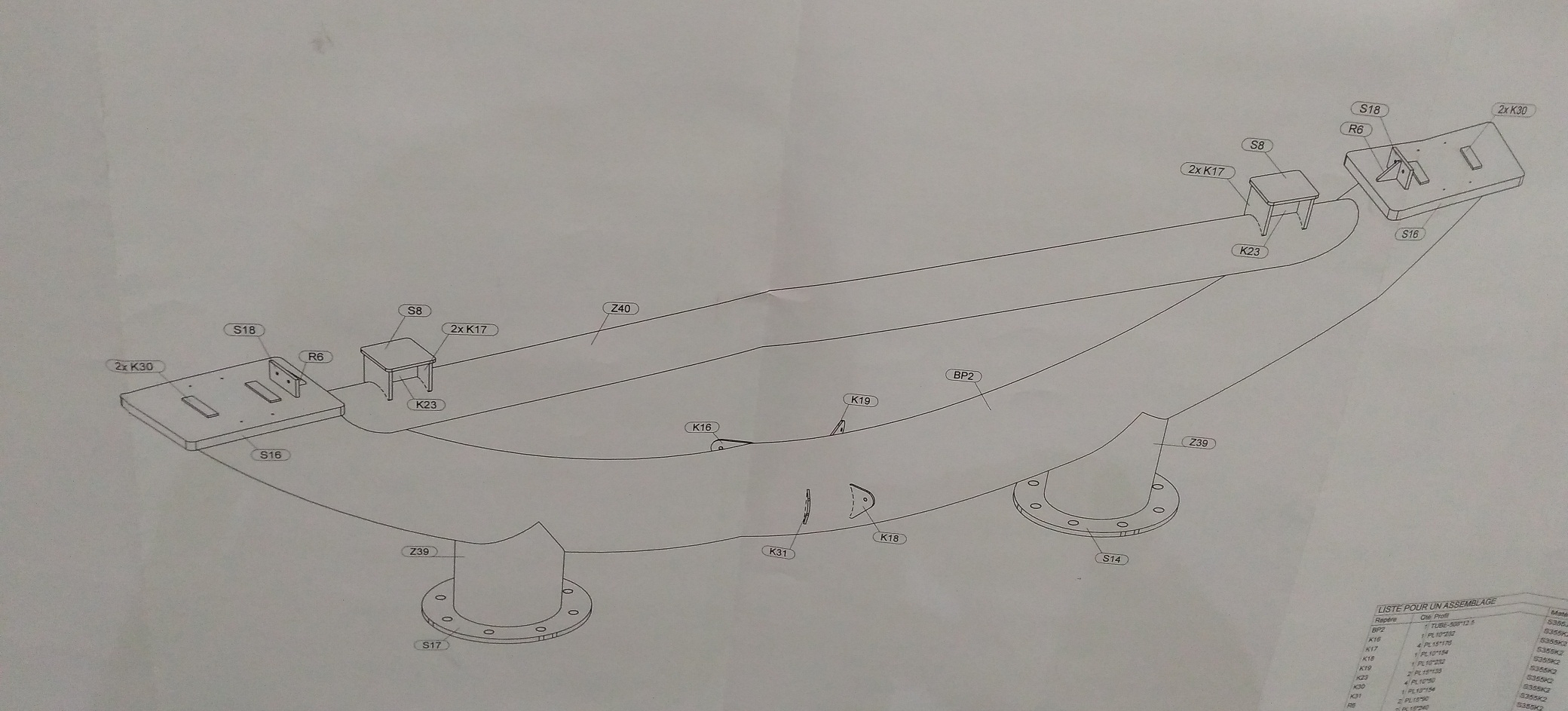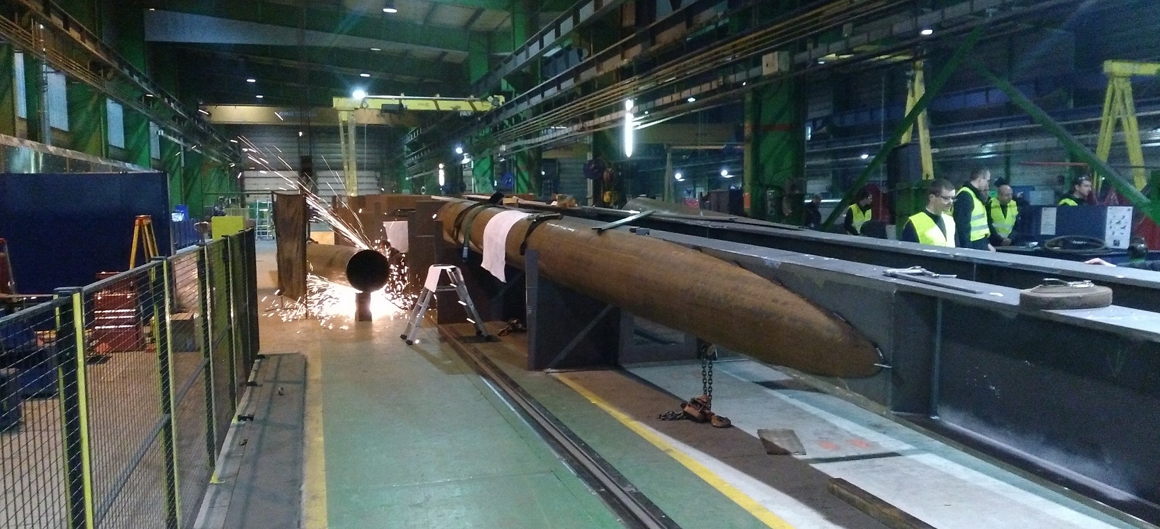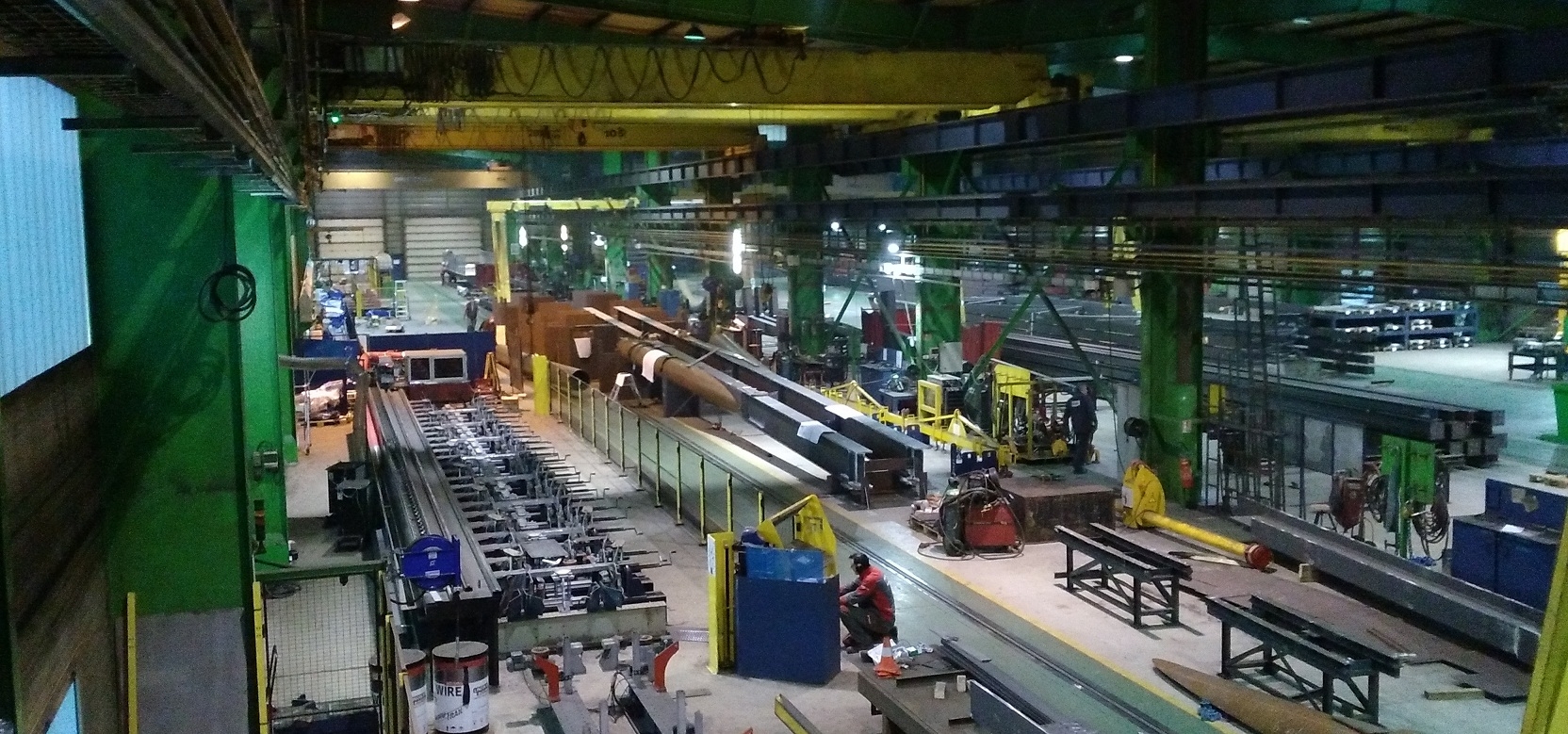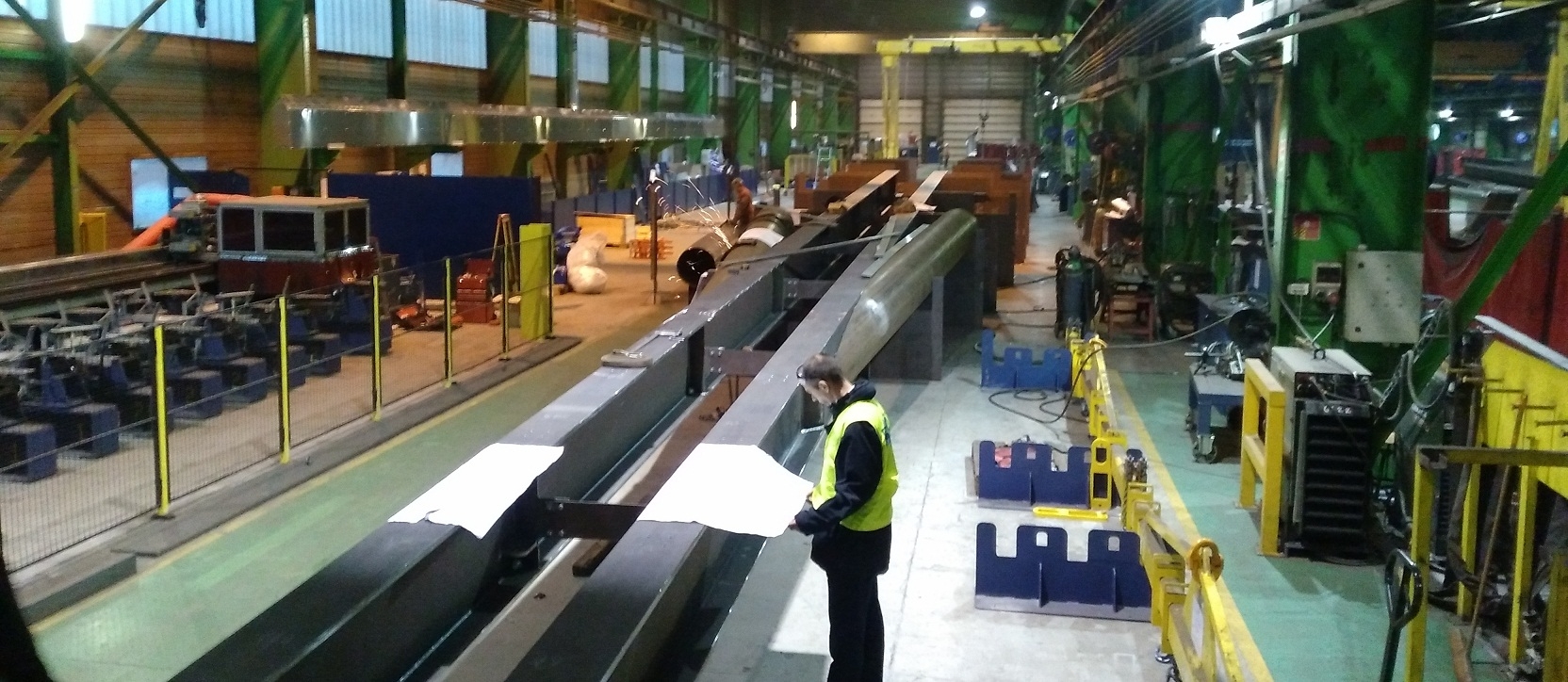 … puis nous avons vu le début du montage "à blanc" (essai de montage en atelier avant le montage définitif sur place) de la passerelle : les deux poutres sont ici très rapprochées pour gagner de l’espace dans l’atelier…